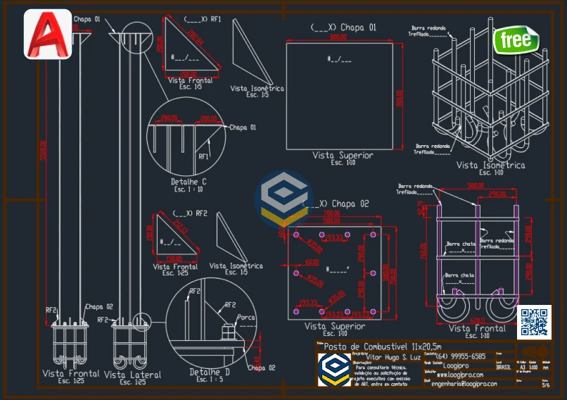Este conteúdo é 100% gratuito e editável, permitindo ajustar medidas, conexões e soluções construtivas da estrutura metálica. Uma base confiável para estudo, apresentação e personalização de projetos de posto de combustível.