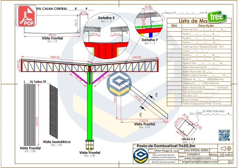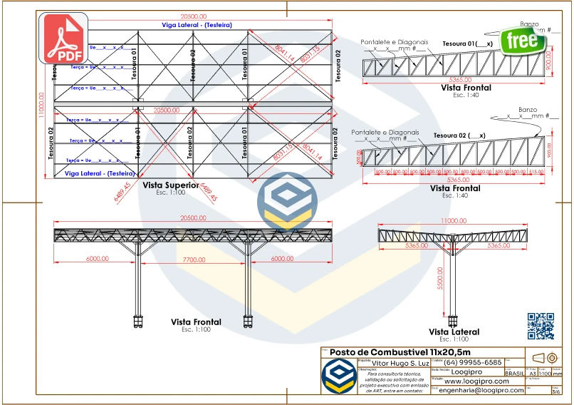 O Desenho Técnico Posto de Combustível 11x20m foi desenvolvido como um material de referência técnica para engenheiros, serralheiros e profissionais da construção civil que desejam compreender o funcionamento, o dimensionamento e a representação gráfica de estruturas metálicas aplicadas a postos de combustível.