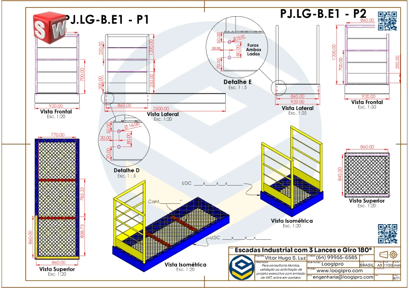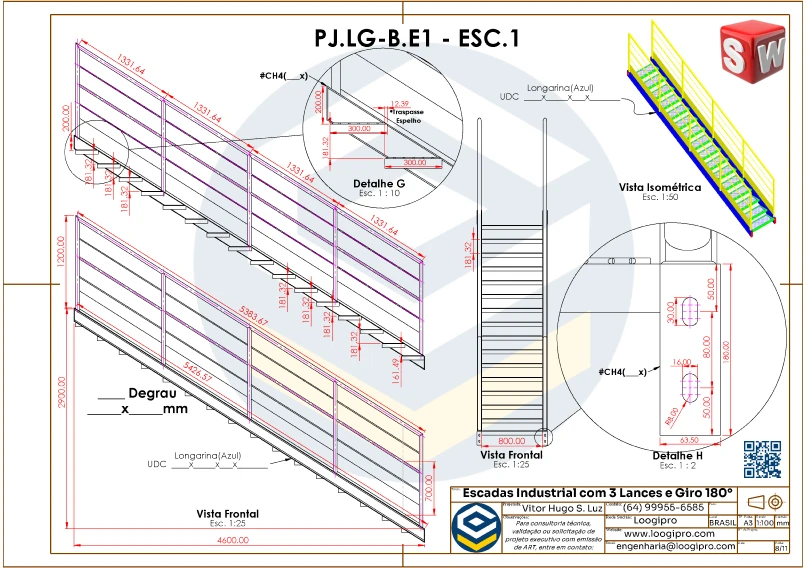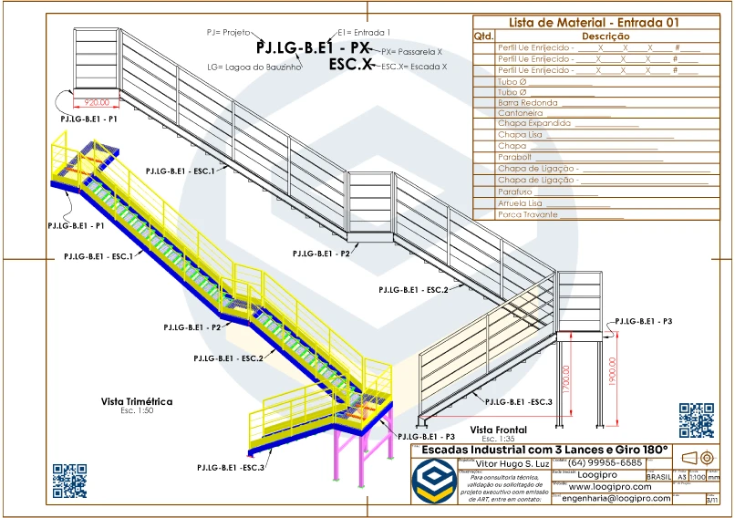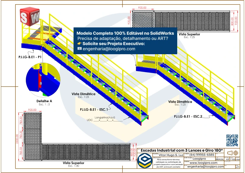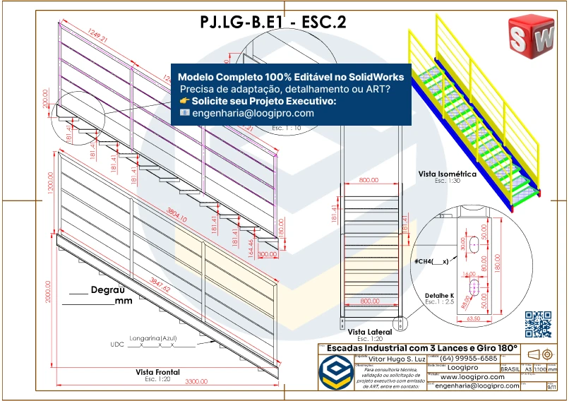 O Projeto Escada Metálica com 3 Lances e Giro de 180 Graus – Drawing foi desenvolvido para engenheiros, projetistas e profissionais que buscam praticidade, segurança e versatilidade em soluções de acesso para ambientes industriais, logísticos e comerciais.
