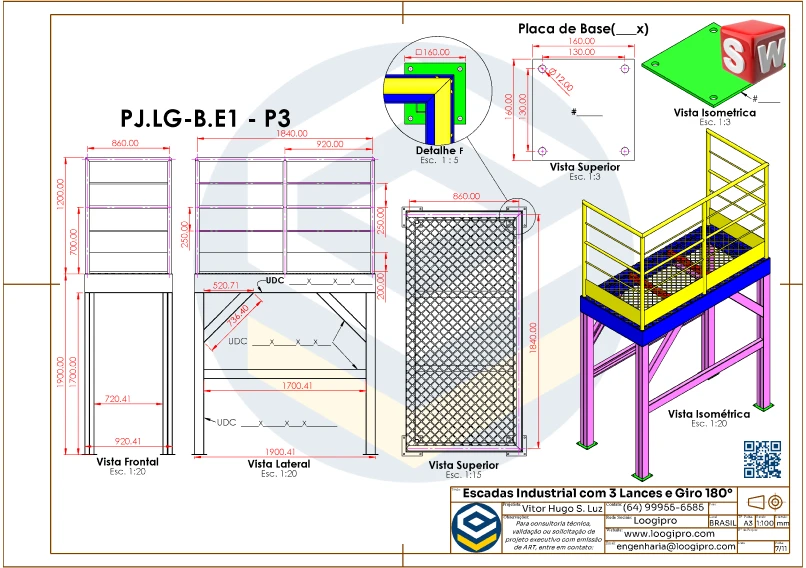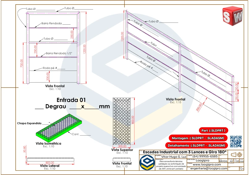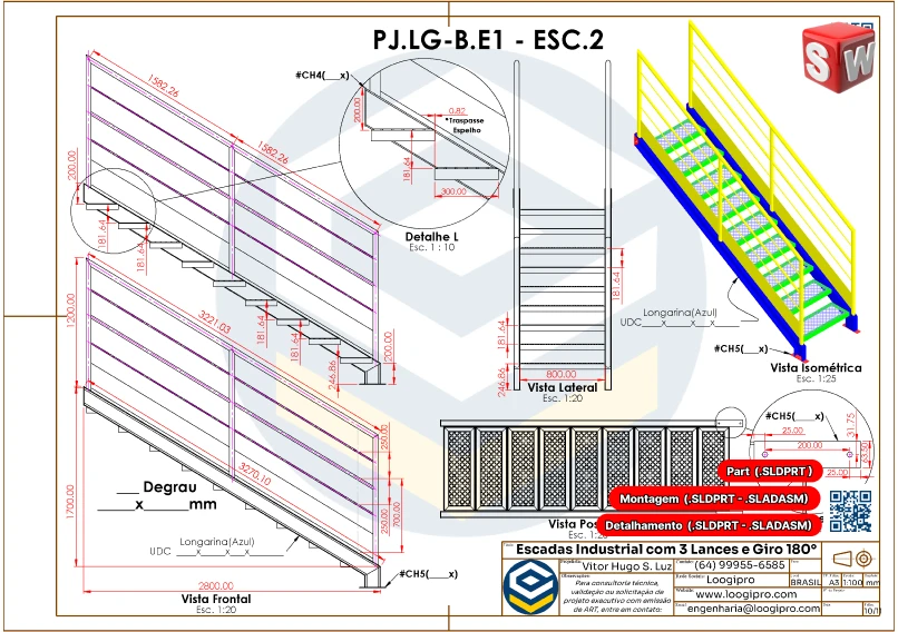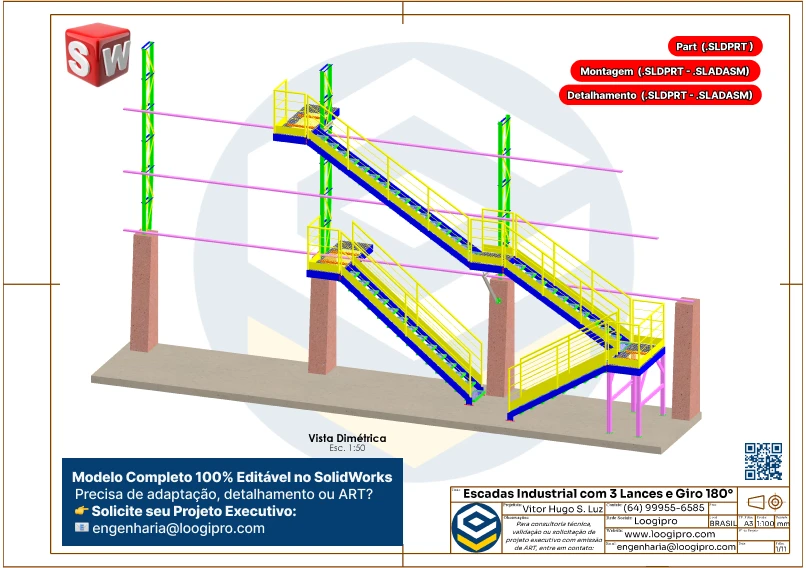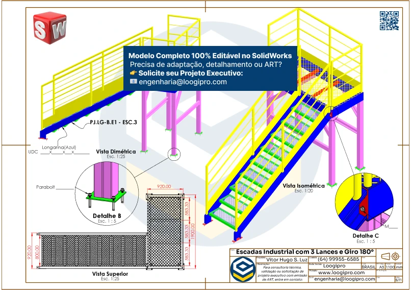 Escada Metálica com 3 Lances e Giro de 180 Graus – Drawing – Modelo Editável no SolidWorks