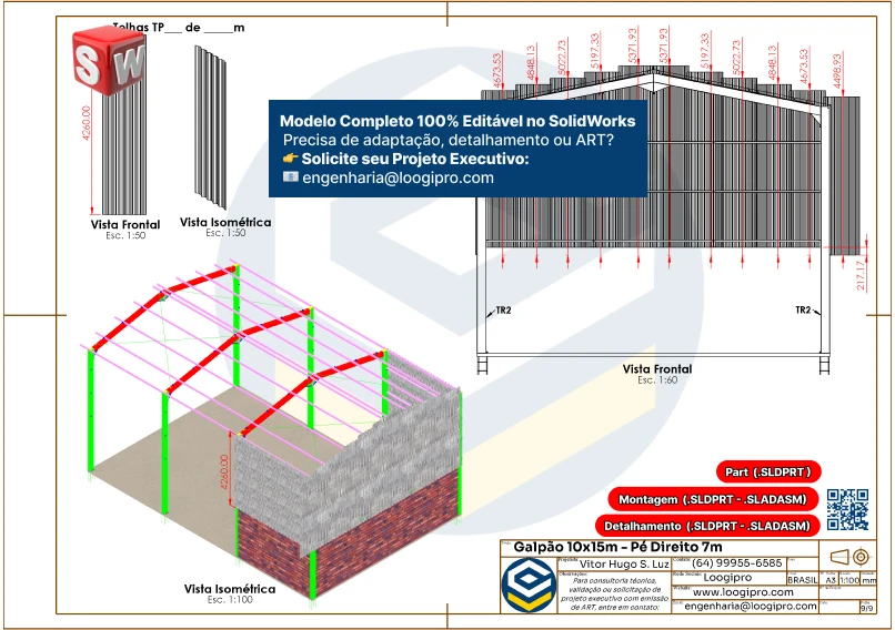 O Projeto Galpão Metálico 10x15m – Pé Direito de 7m – Estrutura Metálica foi desenvolvido para engenheiros e projetistas que buscam agilidade, precisão e versatilidade em projetos industriais, comerciais ou agrícolas. Este modelo foi inteiramente criado em SolidWorks e acompanha arquivos editáveis: Drawing (folha com detalhamento completo e cotas principais), além de todos os arquivos Part (peças) e Assembly (montagem), fundamentais para formar o projeto principal Drawing. Tudo pronto para adaptação conforme as necessidades da sua obra ou cliente.