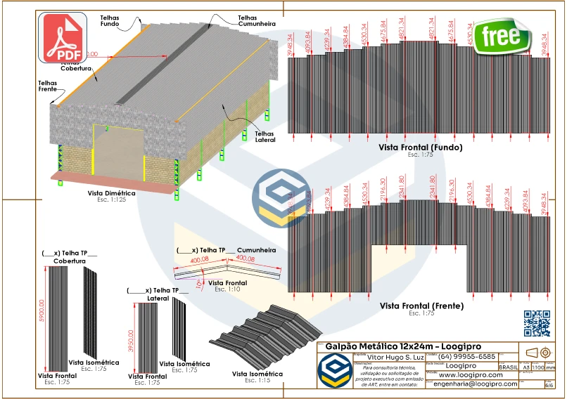 📦Modelo Galpão Metálico 12x24m – PDF – Fechamento Misto