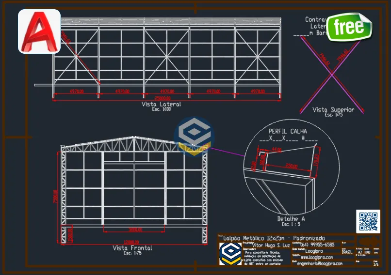 📥Inclui 📄 Planta DWG com vistas frontal, lateral, superior e detalhe de calha. Projeto com fechamento em telha metálica 6m