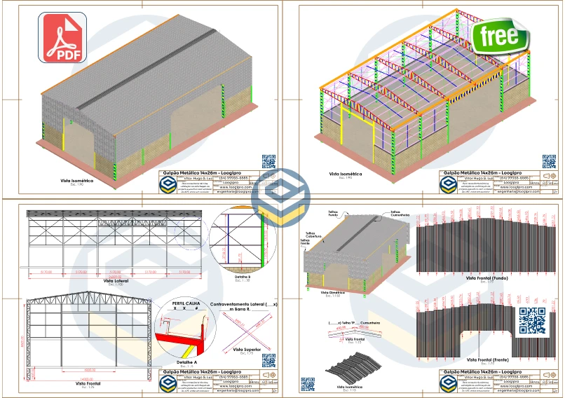 Os projetos em PDF gratuitos foram desenvolvidos para agilizar a vida dos profissionais da construção civil e das estruturas metálicas. Eles oferecem uma referência visual rápida, com dimensões gerais, permitindo avaliar o modelo de forma prática antes de optar por um projeto completo e editável.