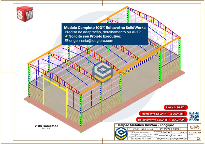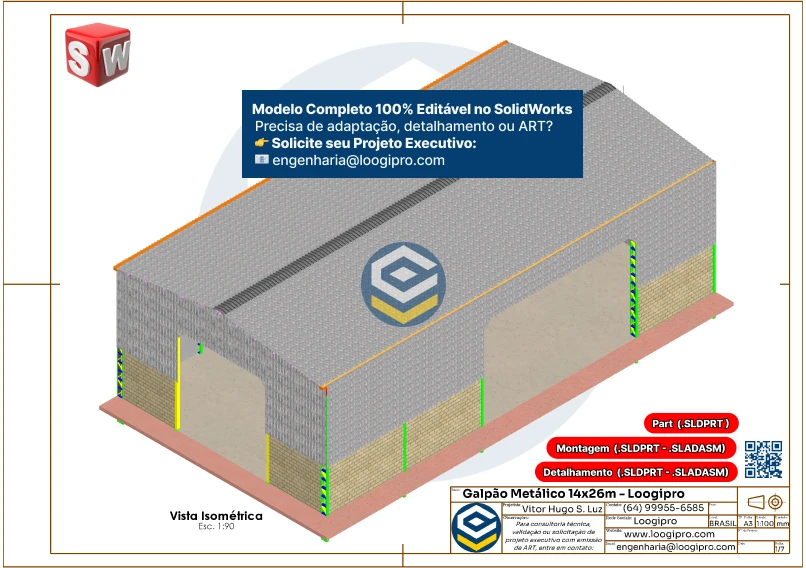 O Projeto Galpão Metálico 14x26m – Estrutura com 2 Águas foi desenvolvido para engenheiros e projetistas que buscam agilidade, precisão e versatilidade em projetos industriais e logísticos. O produto inclui arquivos editáveis no SolidWorks: Drawing (folha de detalhamento com todas as vistas e dimensões), acompanhado dos arquivos de Part (peças) e Assembly (montagem), que formam a base completa do projeto técnico. Assim, você recebe todos os componentes para adaptar e personalizar seu projeto conforme as necessidades de cada obra.