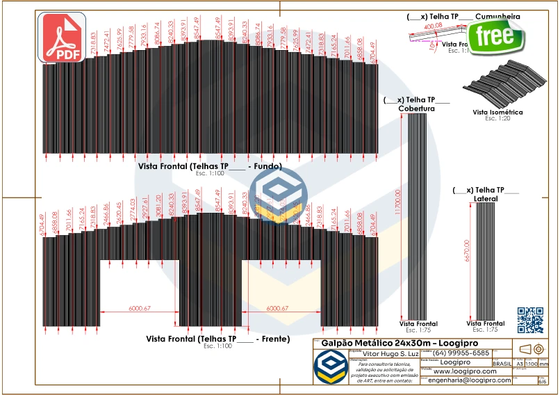 📥Inclui 📄 Arquivo PDF com vistas frontal, lateral e superior, detalhando as duas entradas frontais e fechamento lateral em telha metálica 6m