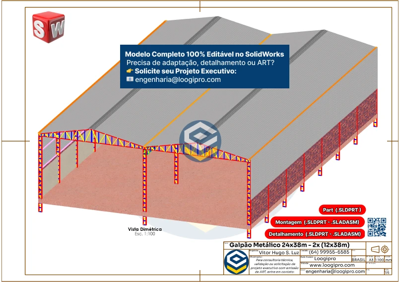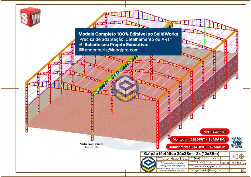 O Projeto Galpão Metálico Geminado 24x38m – Estrutura Modular Integrada foi desenvolvido para engenheiros e projetistas que buscam agilidade, precisão e versatilidade em projetos industriais de médio e grande porte. O produto inclui arquivos editáveis no SolidWorks: Drawing (detalhamento completo, com todas as dimensões), acompanhado dos arquivos de Part (peças) e Assembly (montagem), que são necessários para formar o arquivo principal Drawing. Assim, você recebe todos os componentes para adaptar e personalizar seu projeto conforme as necessidades específicas da aplicação.