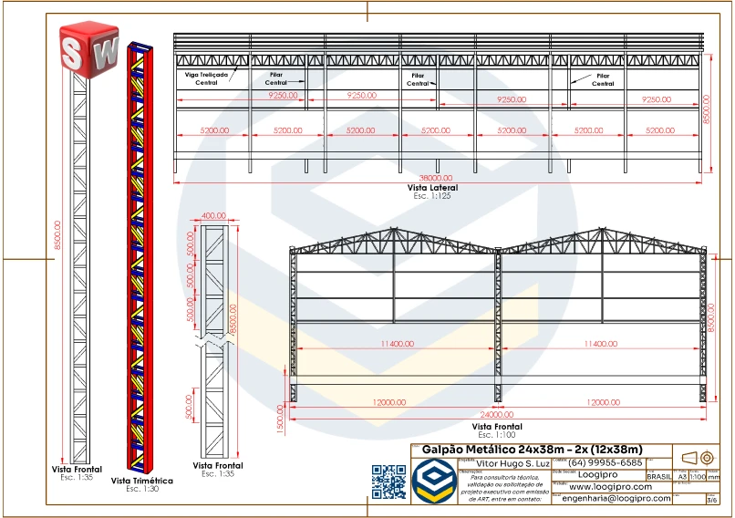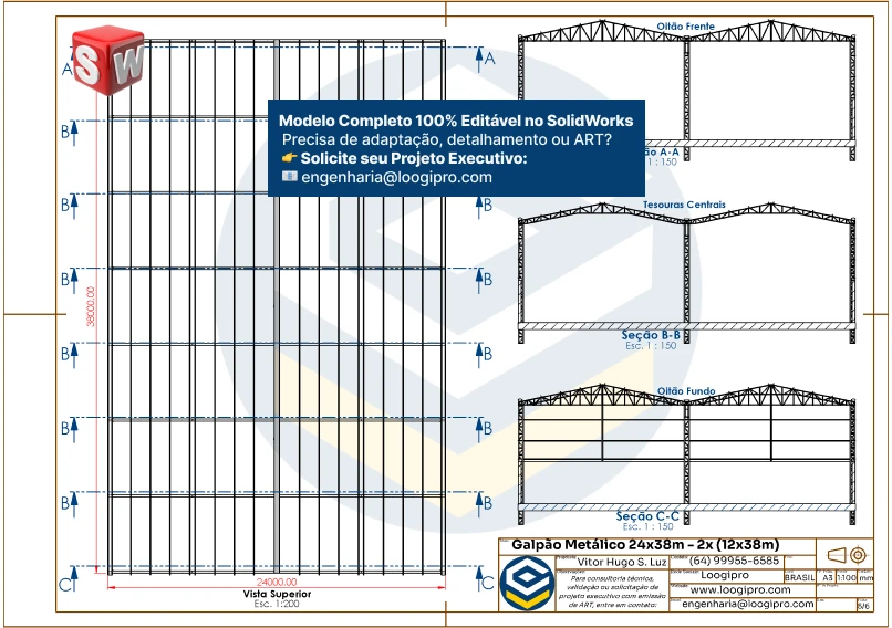 O projeto Galpão Metálico Geminado 24x38m é totalmente editável, garantindo liberdade total para ajustes de medidas, conexões, espaçamentos entre módulos e elementos estruturais. Ideal para obras com necessidade de galpões interligados, o modelo permite que o profissional ganhe produtividade e padronização em todas as etapas do seu desenvolvimento.