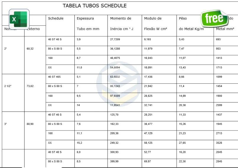📥Inclui | 📄 Planilha automatizada de cálculo de flambagem + tabela de tubos Schedule para consulta técnica |