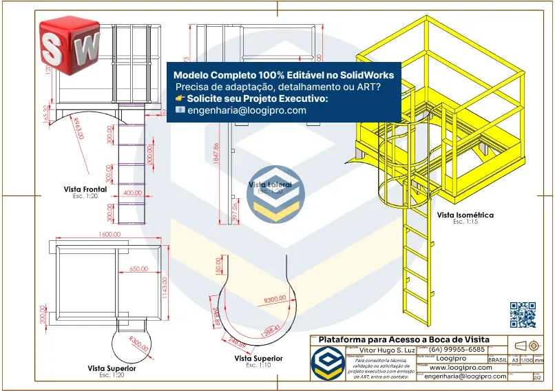 O projeto foi modelado no SolidWorks com foco em robustez, praticidade e adequação normativa. Inclui escada com corrimão, piso metálico atualizado e guarda-corpo completo, além de detalhes técnicos e cotas fundamentais.