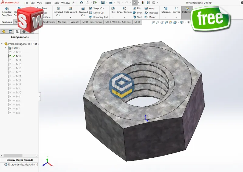 Porca Hexagonal DIN 934 – 3D com Tabela de Configuração é um arquivo gratuito e editável no SolidWorks (.SLDPRT), ideal para projetos de fixação, montagens mecânicas e catálogos industriais padronizados.