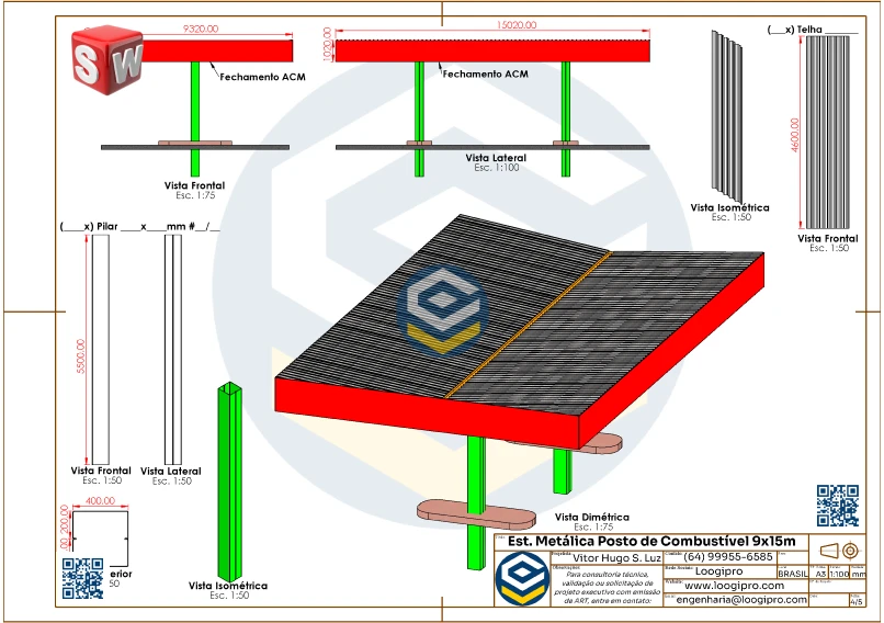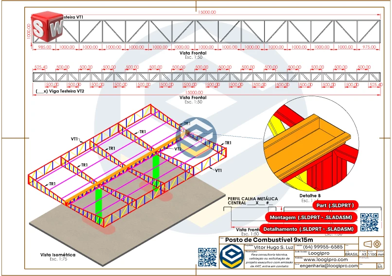O Projeto Posto de Combustível 9x15m – 4 Pilares – Estrutura Metálica foi desenvolvido para engenheiros e projetistas que buscam agilidade, precisão e versatilidade em projetos residenciais ou industriais. O produto inclui arquivos editáveis no SolidWorks: Drawing (detalhamento completo, com todas as dimensões), acompanhado dos arquivos de Part (peças) e Assembly (montagem), que são necessários para formar o arquivo principal Drawing. Assim, você recebe todos os componentes para adaptar e personalizar seu projeto conforme as necessidades específicas de cada aplicação.
