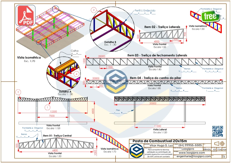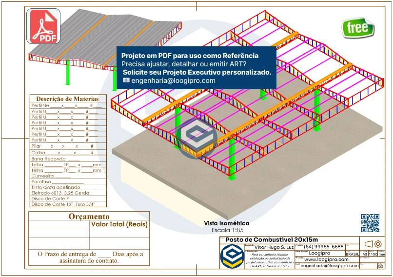 O Projeto Arquitetônico Posto de Combustível 15x20m foi elaborado como um material de referência técnica para engenheiros, serralheiros e profissionais da construção civil que desejam compreender a aplicação e o funcionamento de estruturas metálicas em coberturas de postos de combustível.
