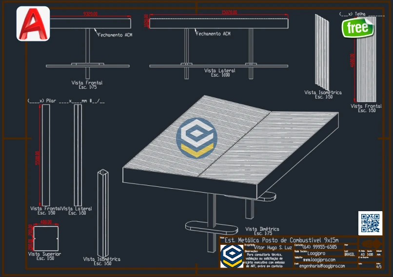 Este projeto é 100% gratuito e editável, permitindo total liberdade para ajustar medidas, conexões e detalhes da estrutura metálica. Uma excelente base para quem deseja compreender a composição estrutural de um posto de combustível metálico e otimizar seu portfólio técnico.