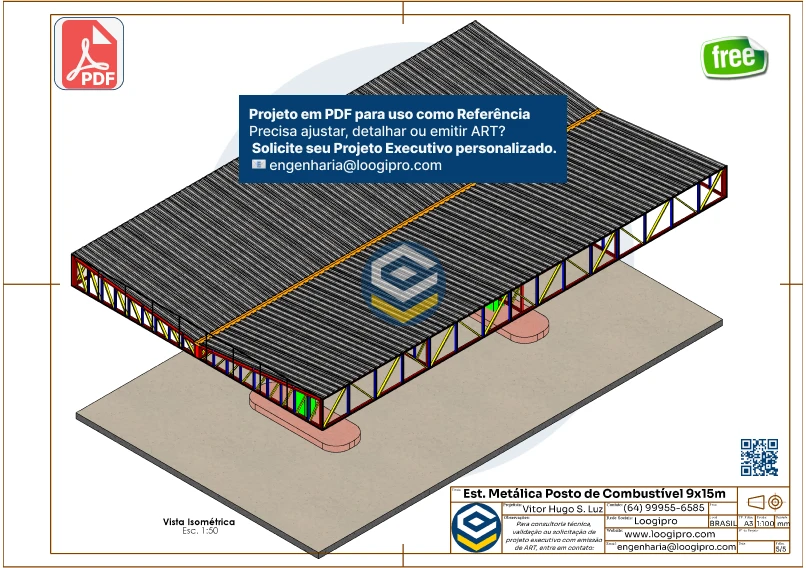 O Projeto Estrutural Posto de Combustível 9x15m foi desenvolvido como um material de referência técnica para engenheiros, serralheiros e profissionais da construção civil que desejam compreender a aplicação e o comportamento de estruturas metálicas em coberturas de postos de combustível.