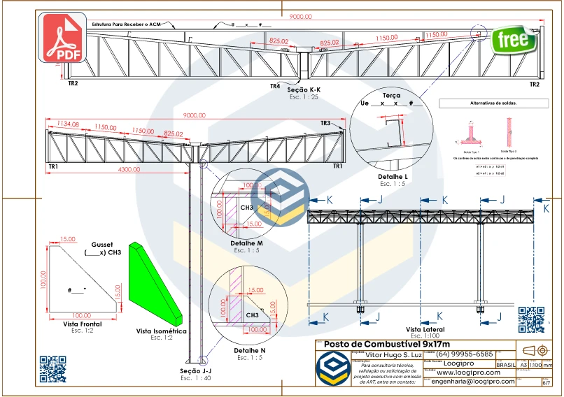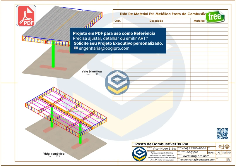 O Projeto Estrutural Posto Metálico 9x17m foi desenvolvido como um material de referência técnica para engenheiros, serralheiros e profissionais da construção civil que buscam compreender a concepção e o detalhamento de estruturas metálicas aplicadas a postos de combustível.