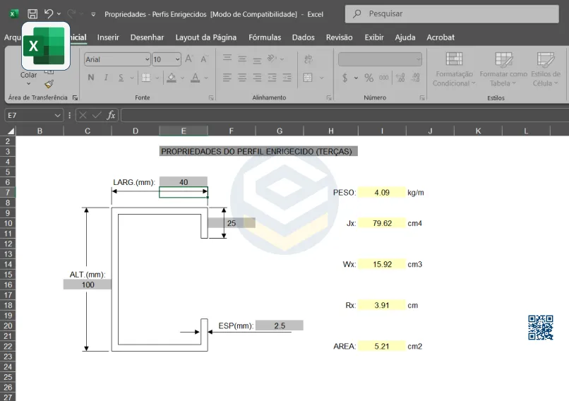 📦Modelo | Planilha de Cálculo de Propriedades do Perfil U Enrijecido (Terças) |