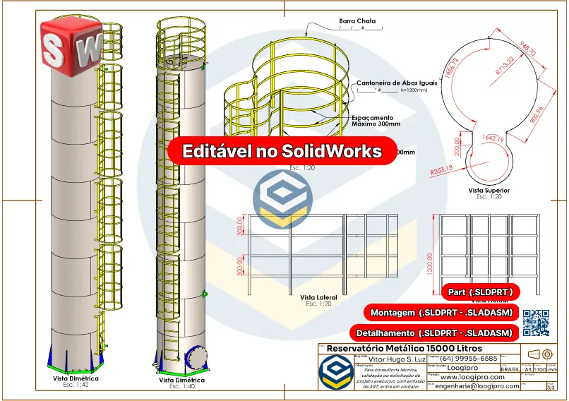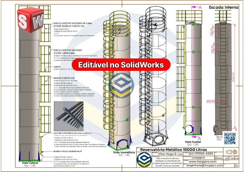 O modelo é 100% editável no SolidWorks, permitindo ajustes técnicos, alterações dimensionais, inclusão de elementos e aplicação de normas específicas. Seja para um sistema hidráulico, reservatório de água potável ou estrutura complementar, o Reservatório Metálico 15000 Litros – Cilíndrico – Drawing oferece liberdade técnica e agilidade no desenvolvimento.