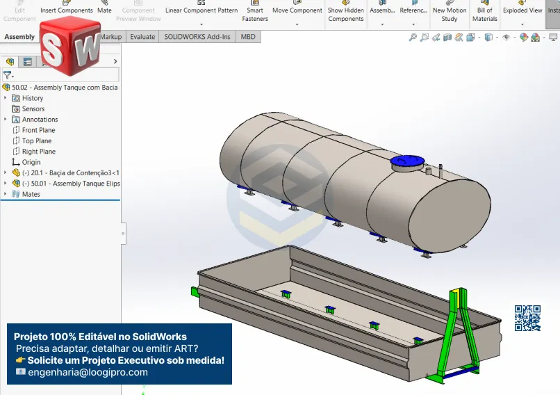 Além da praticidade, o projeto é entregue totalmente editável no SolidWorks, permitindo alterações geométricas, personalização de volume, espessuras e adaptação conforme as condições de operação e transporte.