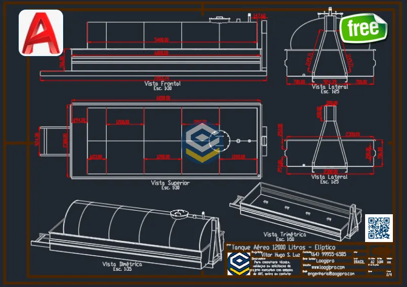 O Tanque Aéreo 12000 Litros – Elíptico – DWG é um projeto técnico gratuito em formato 2D, ideal para engenheiros, projetistas e técnicos que utilizam o AutoCAD ou qualquer outro software compatível com arquivos DWG para desenvolvimento de projetos industriais.